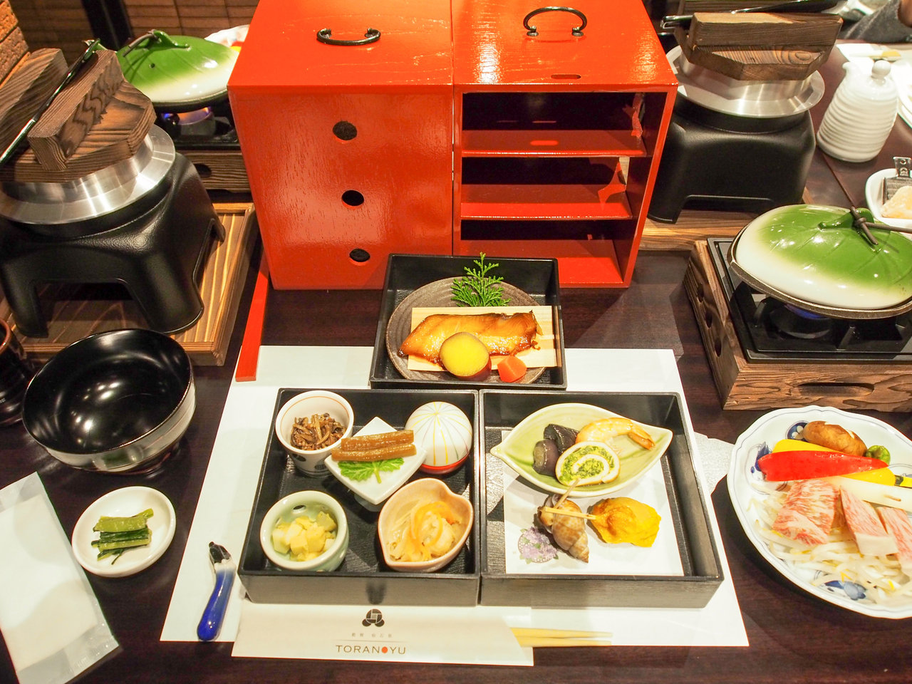 さてさて、楽しみの食事ですが夕飯はこんな感じの懐石料理。いろんな種類の前菜はどれも美味しかったです。